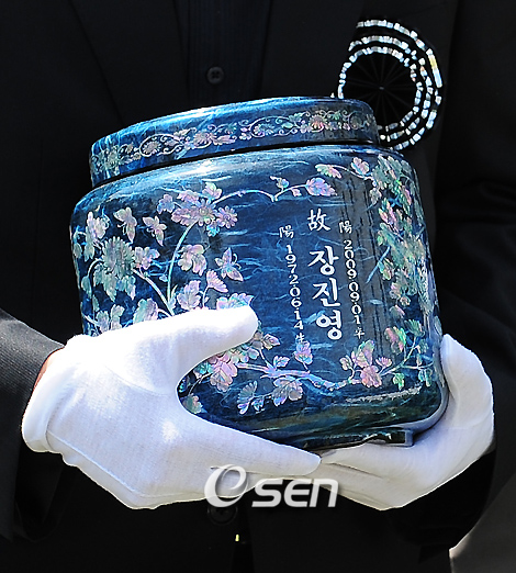 지난 1일 오후 37세의 꽃다운 나이에 세상과 이별한 톱스타 장진영의 장례식이 4일 오후 경기도 광주시 오포읍 신현리 '분당 스카이캐슬 추모공원'에서 엄숙하게 치러졌다. 장진영은 지난해 9월 위암 검진을 받고 투병생활에 들어갔으나 최근 암세포가 몸 전체로 퍼져 의식을 잃을 정도로 상태가 나빠졌다. 그 동안 장진영의 빈소에는 동료 연예인들과 팬들의 조문 행렬이 이어졌다. 추모식을 마치고 장진영의 유골함이 옮겨지고 있다./광주(경기)=민경훈 기자 rumi@osen.co.kr