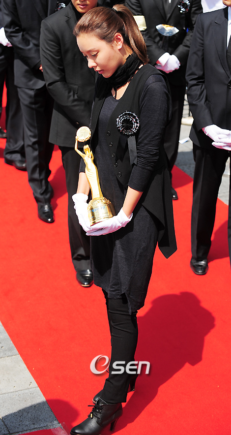 지난 1일 오후 37세의 꽃다운 나이에 세상과 이별한 톱스타 장진영의 장례식이 4일 오후 경기도 광주시 오포읍 신현리 '분당 스카이캐슬 추모공원'에서 엄숙하게 치러졌다. 장진영은 지난해 9월 위암 검진을 받고 투병생활에 들어갔으나 최근 암세포가 몸 전체로 퍼져 의식을 잃을 정도로 상태가 나빠졌다. 그 동안 장진영의 빈소에는 동료 연예인들과 팬들의 조문 행렬이 이어졌다. 김아중이 장진영의 트로피를 들고 추모식장으로 향하고 있다./광주(경기)=민경훈 기자 rumi@osen.co.kr