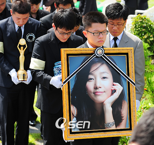 지난 1일 오후 37세의 꽃다운 나이에 세상과 이별한 톱스타 장진영의 장례식이 4일 오후 경기도 광주시 오포읍 신현리 '분당 스카이캐슬 추모공원'에서 엄숙하게 치러졌다. 장진영은 지난해 9월 위암 검진을 받고 투병생활에 들어갔으나 최근 암세포가 몸 전체로 퍼져 의식을 잃을 정도로 상태가 나빠졌다. 그 동안 장진영의 빈소에는 동료 연예인들과 팬들의 조문 행렬이 이어졌다. 추모식을 마치고 故장진영의 영정과 유골함이 안치실로 옮겨지고 있다./광주(경기)=민경훈 기자 rumi@osen.co.kr