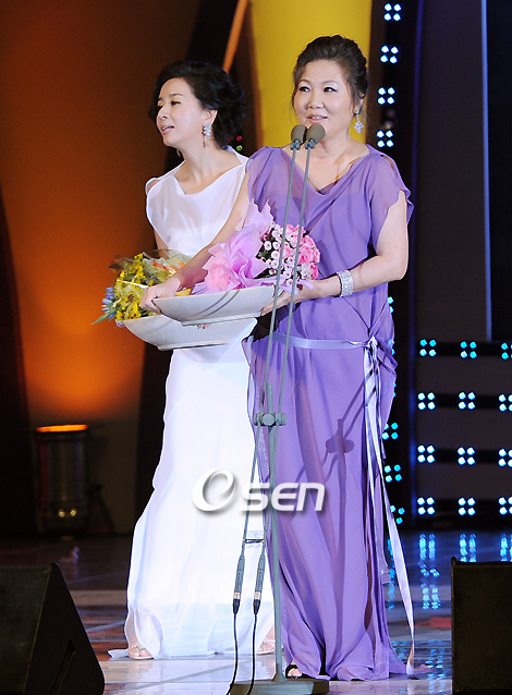 제17회 이천 춘사대상영화제 시상식이 5일 오후 경기도 이천시 설봉공원 도자기엑스포 야외특설 공연장에서 열렸다. 춘사대상영화제는 한국영화의 선각자인 춘사 나운규 감독의 역사적 의미를 기리고 영화 발전에 기여한 영화인 및 우수한 작품을 선정, 시상함으로써 영예를 부여하는 대한민국 대표 영화상 중 하나이다. 지난 9월 1일 개막해 5일까지 본선 진출작을 대상으로 일반인 시사회를 진행했고 이날 시상식을 끝으로 폐막된다. 이혜숙과 김해숙이 여우조연상을 수상하고 있다./이천=윤민호 기자ymh@osen.co.kr