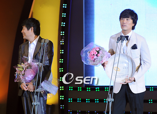 제17회 이천 춘사대상영화제 시상식이 5일 오후 경기도 이천시 설봉공원 도자기엑스포 야외특설 공연장에서 열렸다. 춘사대상영화제는 한국영화의 선각자인 춘사 나운규 감독의 역사적 의미를 기리고 영화 발전에 기여한 영화인 및 우수한 작품을 선정, 시상함으로써 영예를 부여하는 대한민국 대표 영화상 중 하나이다. 지난 9월 1일 개막해 5일까지 본선 진출작을 대상으로 일반인 시사회를 진행했고 이날 시상식을 끝으로 폐막된다. 성동일과 박희순이 남우조연상을 수상하고 있다./이천=윤민호 기자ymh@osen.co.kr