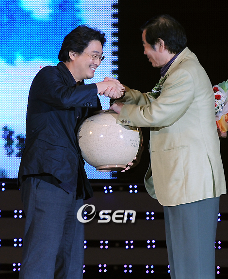 제17회 이천 춘사대상영화제 시상식이 5일 오후 경기도 이천시 설봉공원 도자기엑스포 야외특설 공연장에서 열렸다. 춘사대상영화제는 한국영화의 선각자인 춘사 나운규 감독의 역사적 의미를 기리고 영화 발전에 기여한 영화인 및 우수한 작품을 선정, 시상함으로써 영예를 부여하는 대한민국 대표 영화상 중 하나이다. 지난 9월 1일 개막해 5일까지 본선 진출작을 대상으로 일반인 시사회를 진행했고 이날 시상식을 끝으로 폐막된다. 영화 '박쥐' 박찬욱 감독이 감독상을 수상하고 있다./이천=윤민호 기자ymh@osen.co.kr