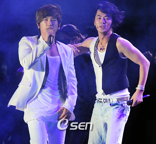 국내 최정상급 가수들이 총 출연하는 한류콘서트 '2009 인천 코리안뮤직웨이브'(Incheon Korean Music Wave)'가 5일 저녁 인천월드컵경기장에서 개최됐다. 티파니 오상진 유리의 진행으로 진행 된 이날 콘서트에는 슈퍼주니어, 소녀시대, 2PM, M(민우), 전진, FT아일랜드, 브라운 아이드 걸스, 이정현, 채연, 카라, 손담비, 백지영, 쥬얼리 등 한국을 대표하는 가수들이 출연해 화려한 공연을 펼쳤다. 한편 이 행사는 MBC 문화방송의 '쇼 음악중심' 특집방송으로 편성해 오는 12일 방송될 예정이다. M과 전진이'Perfect man'을 열창하며 화려한 안무를 선보이고 있다./인천=민경훈 기자 rumi@osen.co.kr