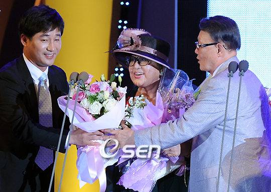 제17회 이천 춘사대상영화제 시상식이 5일 오후 경기도 이천시 설봉공원 도자기엑스포 야외특설 공연장에서 열렸다. 춘사대상영화제는 한국영화의 선각자인 춘사 나운규 감독의 역사적 의미를 기리고 영화 발전에 기여한 영화인 및 우수한 작품을 선정, 시상함으로써 영예를 부여하는 대한민국 대표 영화상 중 하나이다. 지난 9월 1일 개막해 5일까지 본선 진출작을 대상으로 일반인 시사회를 진행했고 이날 시상식을 끝으로 폐막된다. 최은희여사가 춘사대상을 수상 하고 있다./이천=윤민호 기자ymh@osen.co.kr
