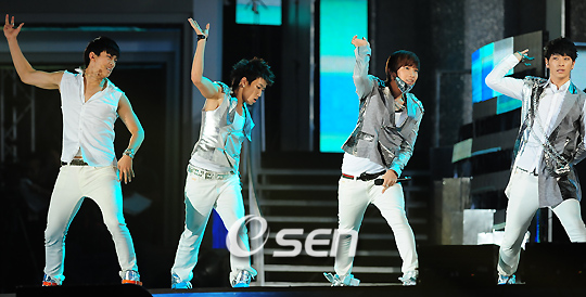 국내 최정상급 가수들이 총 출연하는 한류콘서트 '2009 인천 코리안뮤직웨이브'(Incheon Korean Music Wave)'가 5일 저녁 인천월드컵경기장에서 개최됐다. 티파니 오상진 유리의 진행으로 진행 된 이날 콘서트에는 비, 슈퍼주니어, 소녀시대, 2PM, M(민우), 전진, FT아일랜드, 브라운 아이드 걸스, 이정현, 채연, 카라, 백지영, 쥬얼리 등 한국을 대표하는 가수들이 출연해 화려한 공연을 펼쳤다. 한편 이 행사는 MBC 문화방송의 '쇼 음악중심' 특집방송으로 편성해 오는 12일 방송될 예정이다. 2PM이 노래 '10점 만점에 10점'을 열창하며 화려한 안무를 선보이고 있다./인천=민경훈 기자 rumi@osen.co.kr