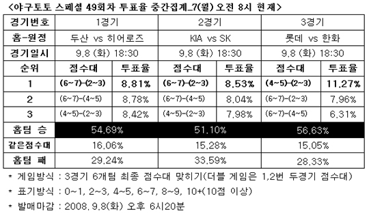 [야구토토] 2009시즌 프로야구 3경기 대상 야구토토 스페셜 49회차 투표율 중간집계 두산-KIA-롯데 우세한 경기 펼칠 것…8일 오후 6시20분 발매마감 대다수 국내 야구팬들은 오는 8일 오후에 벌어지는 2009시즌 국내프로야구 KIA 타이거즈-SK 와이번스전에서 KIA의 승리를 전망했다. 스포츠토토 공식 온라인 발매 사이트인 베트맨(www.betman.co.kr)은 오는 8일 오후에 펼쳐지는 두산-히어로즈, KIA-SK, 롯데-한화 등 국내 프로야구 3경기를 대상으로 한 야구토토 스페셜 49회차 투표율 중간집계 결과 전체 참가자의 절반인 51.10%가 선두 KIA가 SK의 추격을 뿌리치고 선두를 굳게 지킬 것으로 전망했다고 밝혔다. 33.59%는 SK의 승리를 내다봤고 나머지 15.28%는 양팀이 같은 점수대를 기록할 것으로 예상했다. 최종 점수대로는 6~7점-2~3점으로 KIA 승리(8.53%)가 가장 많았고, 6~7점-4~5점 KIA 승리(8.04%), 4~5점-2~3점 KIA 승리(7.98%)가 뒤를 이었다. 1경기 두산-히어로즈전은 참가자의 54.69%가 홈팀 두산의 승리를 예상했고, 29.24%는 원정팀 히어로즈의 우세에 투표했다. 같은 점수대를 예상한 참가자는 16.06%로 나타났다. 최종 점수대로는 6~7점-2~3점으로 두산 승리(8.81%)가 최다를 차지했고 6~7점-4~5점 두산 승리(8.78%), 4~5점-2~3점 두산 승리(8.42%) 순으로 집계됐다. 3경기 롯데-한화전은 56.63%가 플레이오프를 노리는 롯데의 우세를 전망했고, 28.33%는 원정팀 한화의 승리를 예상하는 것으로 나타났다. 나머지 15.05%는 같은 점수대를 기록할 것으로 내다봤다. 최종 점수대에서는 4~5점-2~3점 롯데 승리가 11.27%로 1순위를 차지했고, 6~7점-2~3점 롯데 승리(7.96%), 6~7점-4~5점 롯데 승리(6.31%) 순이었다. 베트맨 관계자는 "국내 야구팬들은 리그 선두자리를 두고 치열한 막바지 접전을 벌이고 있는 KIA와 SK의 맞대결에서 선두 KIA의 우세를 전망했다"며 "올 시즌 보여준 전력에서는 KIA가 앞서 있지만 디펜딩챔피언 SK의 경험과 저력 또한 무시할 수 없을 것"이라고 밝혔다. 한편 이번 야구토토 스페셜 49회차 게임은 경기시작 10분 전인 8일 오후 6시 20분에 발매가 마감된다. '즐거운 스포츠, 즐거운 토토'(http://www.betman.co.kr)