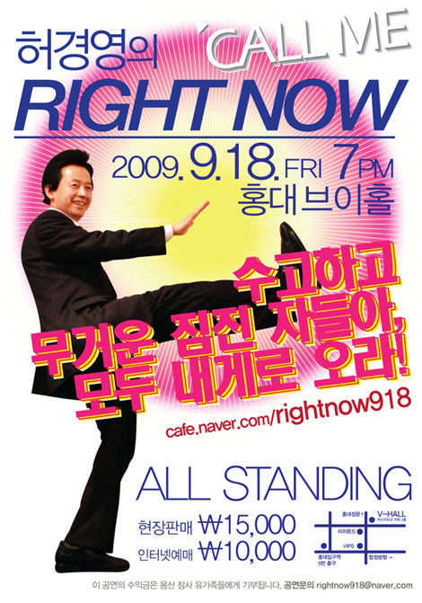 디지털 싱글 ‘콜미’를 발표한 민주공화당 허경영 총재가 단독 콘서트를 연다. 허경영은 오는 18일 오후 7시 홍대 V홀에서 ‘Right Now’공연을 선보일 예정이다. 최근 발표한 콜미 라이브 공연과 함께 1시간 여의 무대로 꾸며질 이번 공연에서 허경영은 깜짝 이벤트도 준비했다. 현재 공연 구성 내용과 출연진은 베일에 쌓여 있지만 허경영은 “답답한 경제상황과 더욱 절망적인 정치상황, 엄혹한 사회현실에 지쳐있는 국민들에게 희망의 메시지를 전달하기 위해 이번 공연을 준비했다”고 설명했다. 또 허경영은 “이 공연은 단지 음악을 듣는 공연이 아니라 수고하고 무거운 짐을 내려놓고 희망과 미래를 꿈꿀 수 있는 시간, 바로 치료와 역사가 함께하는 놀라운 시간이 될 것이다”고 전했다. 한편 이번 공연의 수익금 전액은 용산 참사 유가족에게 전달된다는 게 관계자의 전언이다. miru@osen.co.kr