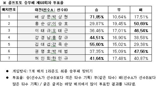 [골프토토] 국내 골프팬들은 PGA투어 코오롱 하나은행 제52회 한국오픈 1라운드에서 배상문의 선전을 점쳤다. 스포츠토토 공식온라인 발매사이트인 베트맨(www.betman.co.kr)은 오는 10일 우정힐스 컨트리 클럽에서 치러지는 한국프로골프(KPGA) 투어 코오롱 하나은행 제52회 한국오픈 1라운드를 대상으로 한 골프토토 승무패 60회차 투표율 중간집계 결과 전체 참가자의 71.85%가 배상문이 박상현보다 좋은 성적을 거둘 것으로 내다봤다고 밝혔다. 2명씩 7개 매치로 나눠 각 매치별로 1라운드 최종 승무패를 예상하는 방식으로 진행되는 이번 게임에서 박상현의 우세를 예상한 비율은 17.51%에 그쳤고 나머지 10.64%는 같은 타수를 기록할 것으로 전망했다. 두번째 매치인 홍순상과 이승호간 대결에서는 전체 참가자의 50.69%가 이승호의 승리를 예상했다. 이태규-오태근, 강경남-홍창규, 김대섭-강욱순, 권명호-박재범, 허인회-한민규 매치의 경우 각각 오태근(46.54%), 강경남(44.51%), 김대섭(55.60%), 박재범(47.56%), 허인회(41.64%)의 우세를 예상한 비율이 높았다. 한편 이번 골프토토 승무패 60회차는 오는 9일 오후 10시에 발매가 마감되며, 공식 적중결과는 10일 발표된다. '즐거운 스포츠, 즐거운 토토'(http://www.betman.co.kr)