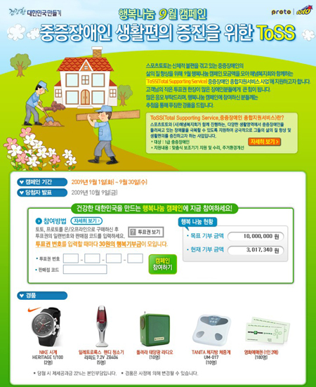 [스포츠 토토] '토토와 함께 행복을 나누세요'. 체육진흥투표권 수탁사업자인 스포츠토토(www.sportstoto.co.kr)가 매월 실시하고 있는 '건강한 대한민국 만들기' 프로젝트 토토 행복나눔 9월 캠페인이 중증장애인 생활편의 증진을 위한 'ToSS' 사업을 후원한다. Toss(Total Supporting Service, 중증장애인 종합지원서비스)란 스포츠토토와 (사)해냄복지회가 함께 진행하는 사업으로 다양한 생활영역에서 중증장애인을 둘러싸고 있는 장애물을 극복할 수 있도록 지원하여 궁극적으로 그들의 삶의 질 행상 및 생활편의를 증진하고자 하는 사업으로 1급 중증장애인들을 대상으로 맞춤식 보조기기 지원 및 수리, 주거환경개선 등의 지원을 하게 된다. 지난 1일부터 시작해 이 달 30일까지 진행되는 이 캠페인은 현재까지(8일 오전 기준) 적립 기부액 301만7340원을 넘어서는 등 토토참가자들의 참여열기 또한 뜨겁다. 행복나눔 9월 캠페인은 참여방법은 토토, 프로토를 온/오프라인으로 구매한 후 스포츠토토 홈페이지(www.sportstoto.co.kr)나 베트맨(www.betman.co.kr) 웹사이트 내의 이벤트 페이지에서투표권의 일련번호와 판매점코드를 입력하면 각 투표권 당 30원의 행복 나눔 기부금이 적립된다. 또한 캠페인에 참여한 사람들에게는 추첨을 통해 나이키 스포츠 시계(2명), 핸디 청소기(5명), 태양광 라디오(10명), 체지방 체중계(10명), 영화예매권(180명) 등 푸짐한 경품이 지급되며 당첨자들은 다음달 9일 발표된다. 스포츠 토토 제공. '즐거운 스포츠, 즐거운 토토'(http://www.betman.co.kr)