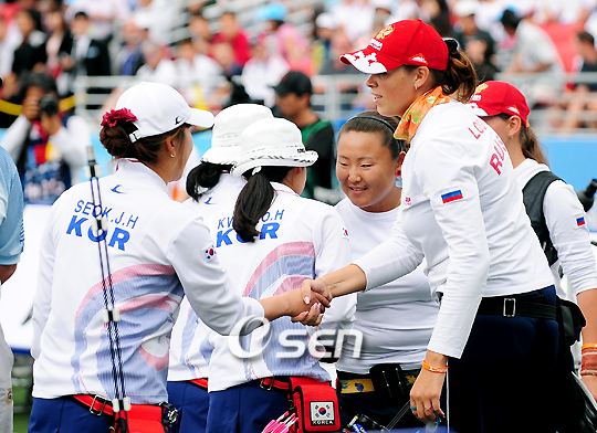 양궁 컴파운드 여자 대표팀이 8일 오후 울산 문수국제양궁장에서 벌어진 세계선수권 단체전서 값진 은메달을 따냈다. 서정희(청원구청) 권오향(울산남구청) 석지현(한국체대)으로 구성된 한국은 처음 출전한 세계선수권서 16강부터 4강까지 브라질(227-215) 스웨덴(227-214) 멕시코(226-224)를 차례로 꺾고 결승에 올랐으나 세계랭킹 1위 러시아에 아깝게 역전패, 무릎을 꿇고 말았다. 경기 후 한국 선수들과 러시아 선수들이 악수를 나누고 있다./울산=윤민호 기자ymh@osen.co.kr