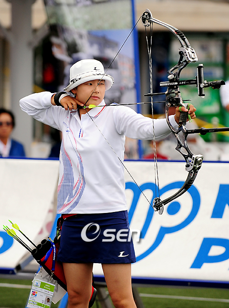 양궁 컴파운드 여자 대표팀이 8일 오후 울산 문수국제양궁장에서 벌어진 세계선수권 단체전서 값진 은메달을 따냈다. 서정희(청원구청) 권오향(울산남구청) 석지현(한국체대)으로 구성된 한국은 처음 출전한 세계선수권서 16강부터 4강까지 브라질(227-215) 스웨덴(227-214) 멕시코(226-224)를 차례로 꺾고 결승에 올랐으나 세계랭킹 1위 러시아에 아깝게 역전패, 무릎을 꿇고 말았다. 여자 대표팀 권오향이 과녁을 정조준하고 있다./울산=윤민호 기자ymh@osen.co.kr