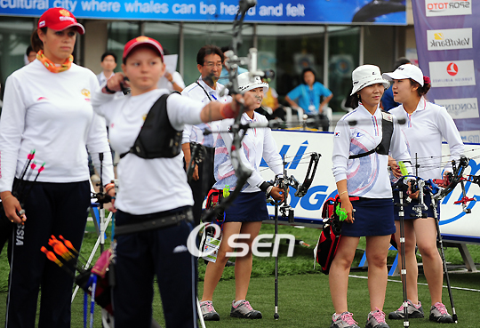 양궁 컴파운드 여자 대표팀이 8일 오후 울산 문수국제양궁장에서 벌어진 세계선수권 단체전서 값진 은메달을 따냈다. 서정희(청원구청) 권오향(울산남구청) 석지현(한국체대)으로 구성된 한국은 처음 출전한 세계선수권서 16강부터 4강까지 브라질(227-215) 스웨덴(227-214) 멕시코(226-224)를 차례로 꺾고 결승에 올랐으나 세계랭킹 1위 러시아에 아깝게 역전패, 무릎을 꿇고 말았다. 한국 선수들이 러시아의 경기를 지켜보고 있다./울산=윤민호 기자ymh@osen.co.kr