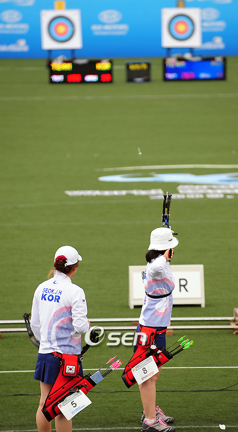 양궁 컴파운드 여자 대표팀이 8일 오후 울산 문수국제양궁장에서 벌어진 세계선수권 단체전서 값진 은메달을 따냈다. 서정희(청원구청) 권오향(울산남구청) 석지현(한국체대)으로 구성된 한국은 처음 출전한 세계선수권서 16강부터 4강까지 브라질(227-215) 스웨덴(227-214) 멕시코(226-224)를 차례로 꺾고 결승에 올랐으나 세계랭킹 1위 러시아에 아깝게 역전패, 무릎을 꿇고 말았다. 한국 여자 대표팀이 과녁을 향해 활을 쏘고 있다./울산=윤민호 기자ymh@osen.co.kr