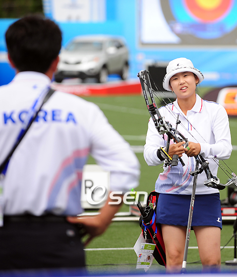 양궁 컴파운드 여자 대표팀이 8일 오후 울산 문수국제양궁장에서 벌어진 세계선수권 단체전서 값진 은메달을 따냈다. 서정희(청원구청) 권오향(울산남구청) 석지현(한국체대)으로 구성된 한국은 처음 출전한 세계선수권서 16강부터 4강까지 브라질(227-215) 스웨덴(227-214) 멕시코(226-224)를 차례로 꺾고 결승에 올랐으나 세계랭킹 1위 러시아에 아깝게 역전패, 무릎을 꿇고 말았다. 권오향이 아쉬운 표정을 짓고 있다./울산=윤민호 기자ymh@osen.co.kr