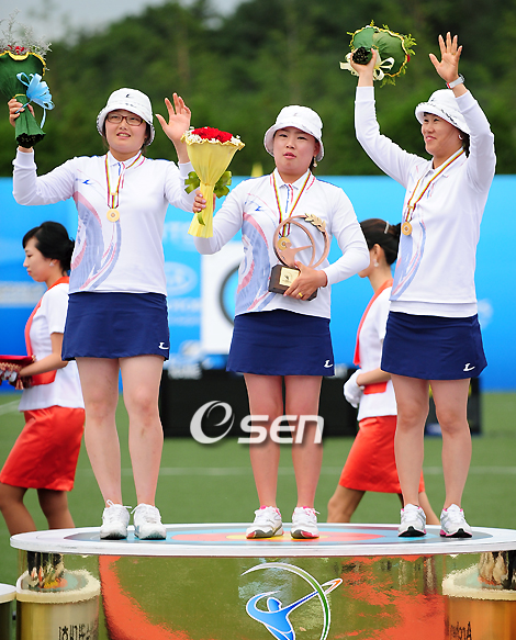 한국 여자 양궁 리커브 대표팀이 8일 오후 울산 문수국제양궁장에서 벌어진 세계선수권 단체전서 4연패에 성공했다. 주현정(현대모비스) 윤옥희(예천군청) 곽예지(대전체고)로 구성된 한국은 16강부터 4강까지 영국(214-201) 폴란드(220-207) 벨로루시(225-216)를 차례로 꺾은 데 이어 결승전서 일본을 꺾었다. 금메달을 딴 여자 대표팀이 시상식에서 기뻐하고 있다./울산=윤민호 기자ymh@osen.co.kr