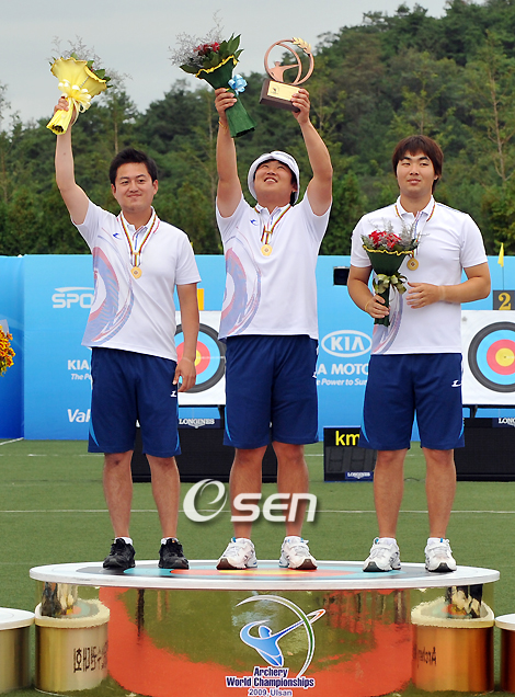 양궁 리커브 남자 대표팀이 8일 오후 울산 문수국제양궁장에서 벌어진 세계선수권 단체전서 5연패를 달성했다. 오진혁(농수산홈쇼핑) 이창환(두산중공업) 임동현(청주시청)으로 구성된 한국은 16강부터 4강까지 스페인(230-210) 러시아(222-214) 일본(231-226)을 여유있게 꺾은 데 이어 결승서 프랑스와 접전 끝에 역전승했다. 이창환-오진혁-임동현(왼쪽부터)이 시상식에서 기뻐하고 있다./울산=윤민호 기자ymh@osen.co.kr
