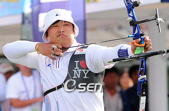 양궁 리커브 남자 대표팀이 8일 오후 울산 문수국제양궁장에서 벌어진 세계선수권 단체전서 5연패를 달성했다. 오진혁(농수산홈쇼핑) 이창환(두산중공업) 임동현(청주시청)으로 구성된 한국은 16강부터 4강까지 스페인(230-210) 러시아(222-214) 일본(231-226)을 여유있게 꺾은 데 이어 결승서 프랑스와 접전 끝에 역전승했다. 남자 대표팀 오진혁이 과녁에 정조준을 하고 있다./울산=윤민호 기자ymh@osen.co.kr