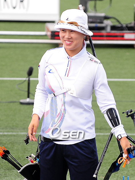 제45회 세계양궁선수권대회 여자 개인전 준결승전이 9일 오후 울산 문수국제양궁장에서 열렸다. 주현정은 나탈리아 산체스(콜롬비아)와 경기서 112-102로 완승을 기록했다. 주현정은 1엔드서 1점을 뒤졌으나 2, 3, 4라운드서 2, 6, 3점을 더 쏴 10점차 승리를 거두고 결승전에 올랐다. 결승에 진출한 주현정이 기뻐하고 있다./울산=윤민호 기자ymh@osen.co.kr