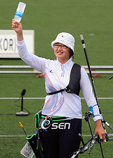 제45회 세계양궁선수권대회 여자 개인전 준결승전이 9일 오후 울산 문수국제양궁장에서 열렸다. 곽예지는 카리나 리피아르스카(폴란드)를 맞아 109-105로 승리를 거뒀다. 곽예지는 1점을 뒤진채 맞은 3엔드서 28점을 쐈고 리피아르스카가 24점에 그쳤다. 이어 곽예지는 4엔드서 1점을 더 쏴 4점차 승리를 거두고 결승에 선착했다. 결승에 진출한 곽예지가 기뻐하고 있다./울산=윤민호 기자ymh@osen.co.kr