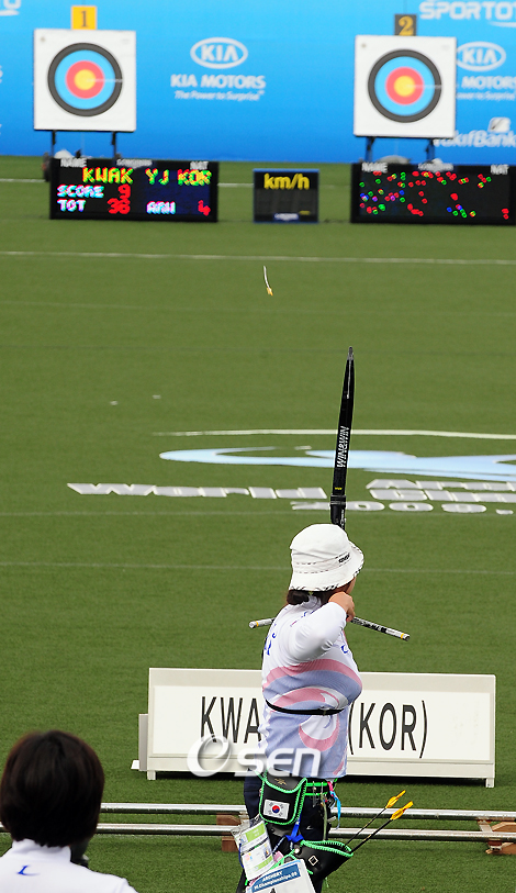 제45회 세계양궁선수권대회 여자 개인전 준결승전이 9일 오후 울산 문수국제양궁장에서 열렸다. 곽예지는 카리나 리피아르스카(폴란드)를 맞아 109-105로 승리를 거뒀다. 곽예지는 1점을 뒤진채 맞은 3엔드서 28점을 쐈고 리피아르스카가 24점에 그쳤다. 이어 곽예지는 4엔드서 1점을 더 쏴 4점차 승리를 거두고 결승에 선착했다. 곽예지가 과녁을 향해 활을 쏘고 있다./울산=윤민호 기자ymh@osen.co.kr