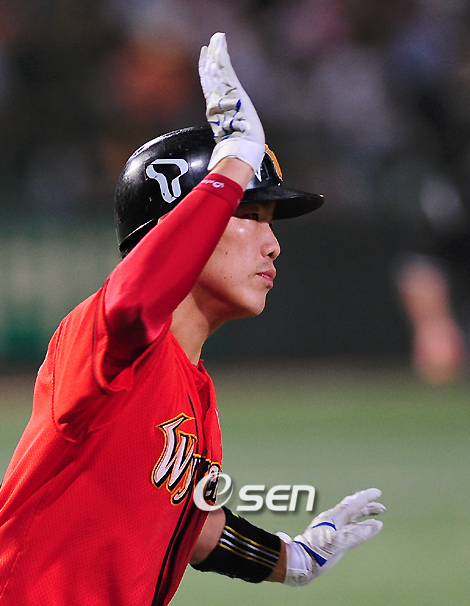 2009 프로야구 1,2위팀인 KIA 타이거즈와 SK 와이번스의 경기가 9일 광주 무등경기장에서 벌어졌다. 파죽의 10연승을 기록중인 SK가 연승을 11로 늘릴지 4연패중인 KIA가 연패를 끊고 리그 1위를 순항할지 주목이 되는 경기다. 6회초 무사 1루 SK 정근우가 역전 투런 홈런을 치고 좋아하고 있다. /광주=손용호 기자spjj@osen.co.kr