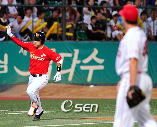 2009 프로야구 1,2위팀인 KIA 타이거즈와 SK 와이번스의 경기가 9일 광주 무등경기장에서 벌어졌다. 파죽의 10연승을 기록중인 SK가 연승을 11로 늘릴지 4연패중인 KIA가 연패를 끊고 리그 1위를 순항할지 주목이 되는 경기다. 6회초 무사 1루 SK 정근우가 역전 투런 홈런을 치고 좋아하고 있다. /광주=손용호 기자spjj@osen.co.kr