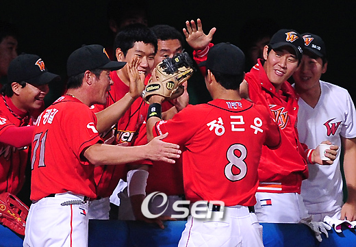 2009 프로야구 1,2위팀인 KIA 타이거즈와 SK 와이번스의 경기가 9일 광주 무등경기장에서 벌어졌다. 파죽의 10연승을 기록중인 SK가 연승을 11로 늘릴지 4연패중인 KIA가 연패를 끊고 리그 1위를 순항할지 주목이 되는 경기다. 6회말 2사 3루 홍세완의 빗맞은 타구를 잘 처리한 정근우를 동료선수들이 반갑게 맞이하고 있다. /광주=손용호 기자spjj@osen.co.kr