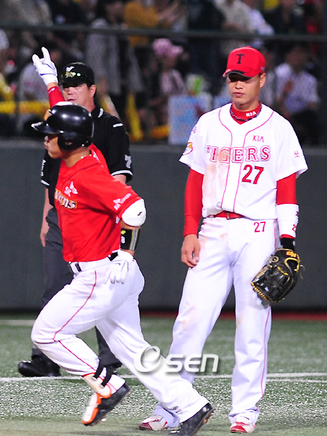 역전우승이 보인다. SK가 또 다시 선두 KIA를 잡았다. 파죽의 11연승을 거두며 1경기차로 바짝 추격, 역전에 청신호를 켰다. SK는 9일 광주구장에서 열린 2009 CJ 마구마구 프로야구 KIA와의 원정경기에서 집요한 철벽계투와 정근우의 역전투런포, 박정권의 쐐기포에 힘입어 3-1로 역전승을 거두었다. 11연승을 올린 SK는 KIA에 1경기차로 바짝 따라붙었다. 충격의 5연패에 빠진 KIA는 이제 1위를 장담하기 어려운 처치가 됐다. KIA가 1회부터 SK를 몰아치는 듯 했다. 1회말 선두타자 이용규가 좌중간을 가르는 3루타를 터트렸다. 이어 김원섭이 깨끗한 중전안타를 날려 가볍게 선제점을 뽑았다. 크게 흔들린 SK 선발 송은범은 나지완을 볼넷으로 내보내 무사 1,2루 대량실점 위기를 맞았다. 그러나 SK는 송은범을 내리고 좌완 정우람을 마운드에 올리는 승부수를 던졌다. KIA는 최희섭 삼진, 김상현 투수 땅볼로 물러났고 이종범이 볼넷을 골랐지만 김상훈이 유격수 땅볼로 잡히면서 절호의 찬스를 날렸다. KIA는 이어진 찬스를 모조리 살리지 못하며 어렵게 경기를 펼쳐갔다. 3회초 무사 1루에서는 나지완의 병살타가 나왔따. 4회초 김상현이 좌전안타로 출루했지만 이종범의 병살타가 나왔다. 5회에서는 선두타자 안치홍이 좌중간 3루타로 기회를 열었지만 SK의 압박수비에 막혀 후속타자들이 모조리 범타로 물러났다. 6회 역시 최희섭이 볼넷을 골랐지만 후속타 불발은 계속됐다. 결국 달아날 기회를 놓치자 SK가 홈런 두 방으로 역전에 성공했다. 6회초 구톰슨을 상대로 박재상이 우익수 앞 안타로 찬스를 열었고 번트에 실패한 정근우가 좌월 장외투런을 날려 역전에 성공했다. 2사후에는 박정권이 우월 장외홈런으로 두들겨 3-1로 경기를 간단히 뒤집었다. SK는 1회부터 필승불펜을 가동하는 승부수로 KIA 공격을 철저하게 차단했다. 송은범이 흔들리자 곧바로 정우람을 올렸고 이어 윤길현, 고효준을 올렸다. 이들은 매회 주자를 내보냈지만 후속타자들을 병살과 범타로 요리하고 위기에서 벗어났다. 특히 9회에는 글로버가 마운드에 올라 1이닝을 매조지하고 승리를 지켰다. 12일만에 선발등판에 나선 KIA 선발 구톰슨은 5회까지 무실점으로 호투했으나 6회 홈런 두 방에 무릎을 꿇었다. KIA는 8회부터 손영민을 올려 차단하고 막판 역전을 노렸지만 무위에 그쳤다. 6회까지 5번의 좋은 찬스를 날린 집중력 부족이 결정적인 패인이 되고 말았고 5연패로 이어졌다. sunny@osen.co.kr 2009 프로야구 1,2위팀인 KIA 타이거즈와 SK 와이번스의 경기가 9일 광주 무등경기장에서 벌어졌다. 파죽의 10연승을 기록중인 SK가 연승을 11로 늘릴지 4연패중인 KIA가 연패를 끊고 리그 1위를 순항할지 주목이 되는 경기다. 6회초 무사 1루 SK 정근우가 역전 투런 홈런을 치고 KIA 김상현 앞을 달리고 있다. /광주=손용호 기자spjj@osen.co.kr
