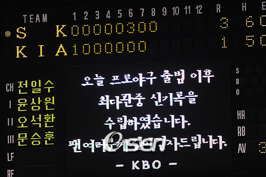'2009 CJ마구마구 프로야구'가 출범 이후 역대 최다관중 신기록을 달성했다. 이미 역대 두번째 최소경기 500만 관중과 출범 이후 최초 2년 연속 500만 관중을 돌파한 2009 프로야구는 9월 9일 현재 전체 532경기 중 488경기를 치뤄 44경기를 남겨둔 가운데 총 관중 5,407,527명을 기록하며 1995년에 기록했던 역대 최다관중인 5,406,374명을 넘어섰다. 제 2회 월드베이스볼클래식 준우승과 함께 화려하게 막을 연 2009 프로야구는 개막전이 거행된 4개 구장에서 총 96,800명이 입장, 역대 개막전 최초로 전 구장 매진을 기록하며 관중 흥행의 신호 탄을 쏘아 올렸고, 이어 어린이날에도 83,500명이 입장 하여 역대 어린이날 최초로 매진을 기록하 는 등 역대 최초로 한 시즌에 전 구장 매진을 두차례 기록하는 진기록을 세웠다. 올 시즌 프로야구는 각 구단 별로 기록적인 관중 증가세에 힘입어 역대 최다관중 기록에 도전하고 있다. 먼저, 히어로즈는 8월 15일, 홈 55경기만에 266,530명이 입장, 전년도 팀 최다 관중 기록을 경신하였고 KIA는 홈 56경기를 치른 8월 26일, 13년만의 팀 최다관중 경신에 이어 9월 5일, 홈 59경기만에 사상 첫 한 시즌 50만 관중을 돌파하였다. 또한, SK는 인천 연고팀 최단경기 70만 관중 돌파에 이어 9월 6일, 홈 60경기만에 765,639명을 기록, 지난 시즌 기록했던 역대 최다관중을 넘어섰다. 한편, 홈에서 8경기를 남겨둔 두산은 현재 916,676명을 기록, 역대 팀 최다관중 기록과 함께 창단 이후 최초로 홈 1백만 관중 돌파를 눈앞에 두고 있고 롯데는 프로야구 최초로 2년 연속 홈 평균 관중 2만명 이상 기록 달성이 유력하다. 올 시즌 1위를 달리고 있는 KIA는 전년대비 47% 관중 증가로 가장 높은 증가율을 보였고, 홈 59경기 가운데 18경기(군산구장 4경기 포함)가 매진되어 17경기 매진을 기록한 롯데를 제치고 가장 많은 매진 기록으로 흥행의 기폭제가 되고 있다. 2009 프로야구는 최다 관중 기록이라는 양적인 성장 뿐만 아니라 입장수익 면에서도 역대 최다인 30,991,197,100원을 기록, 전체 입장수익이 최초로 300억원을 돌파하며, 지난해에 기록한 역대 최다 입장수익인 249억원을 가볍게 뛰어넘었다. sun@osen.co.kr 역대 최다 관중 신기록을 축하하는 광주구장 전광판 /손용호 기자
