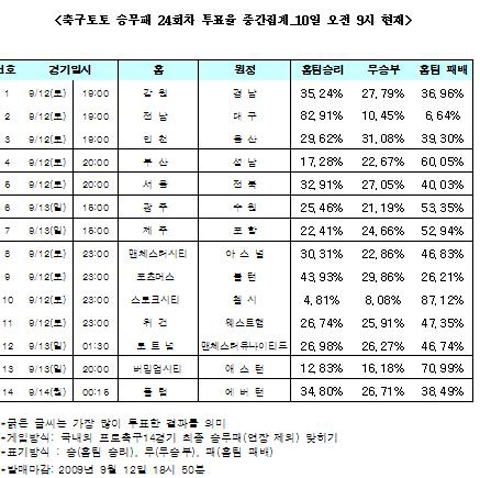[축구토토] 국내 축구팬들은 이번 주말 프리미어리그 토트넘과 맨체스터유나이티드(이하 맨유)와의 경기에서 맨유의 우세를 예상했다. 스포츠토토 온라인 발매사이트인 베트맨(www.betman.co.kr)은 오는 12일(토)부터 14일(월) 새벽(한국시간)까지 벌어지는 K-리그 7경기와 잉글랜드 프리미어리그 7경기 등 총 14경기를 대상으로 한 축구토토 승무패 24회차 투표율 중간집계 결과 프리미어리그 토트넘-맨유전에서 축구팬 46.74%가 원정팀 맨유의 승리를 예상했다고 밝혔다. 반면 홈팀 토트넘의 승리 예상은 26.74% 였으며 무승부 비율은 26.27%로 나타나 맨유가 시즌 개막 후 4연승을 달리고 있는 토트넘을 상대로 우세한 경기를 펼칠 것이라는 예상이 많았다. 한편 맨체스터시티와 아스널의 경기에서는 원정팀 아스널 승리 예상이 46.83%로 맨체스터시티 승리 30.31%, 무승부 22.86%의 비율에 비해 앞섰다. 과연 지난 시즌까지 아스널의 간판 공격수였던 아데바요르가 맨시티로 팀을 옮겨 친정팀을 상대로 골을 기록할 수 있을 지, 축구팬들의 관심이 모아질 것으로 예상된다. 이밖에 축구팬들은 K-리그 전남-대구, 부산-성남, 광주-수원전에서 전남 승리(82.91%), 성남 승리(60.05%), 수원 승리(53.35%)를 예상했다. 한편, 이번 축구토토 승무패 24회차는 오는 12일(토) 오후 6시 50분에 발매 마감되며 모든 경기가 종료된 14일(월) 결과가 공식 발표된다. http://www.betman.co.kr">'즐거운 스포츠, 즐거운 토토'(http://www.betman.co.kr)