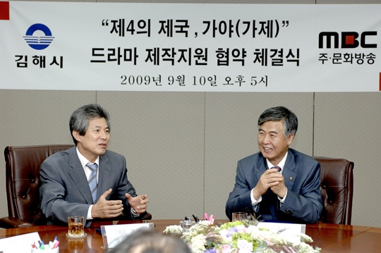철기문화, 해양무역으로 600여 년 동안 찬란한 역사를 꽃피웠지만 신라, 고구려, 백제에 가려져 있던 제 4의 제국 ‘가야’의 드라마 제작이 본격화된다. MBC와 경상남도 김해시는 10일 오후 5시 서울 여의도 MBC 방송센터에서 드라마 ‘가야’ 제작지원 협약을 체결했다. 협약 체결식에는 MBC 엄기영 사장과 김종간 김해시장을 비롯해 공동제작자인 부산MBC 전용성 사장, 울산MBC 황희만 사장, 마산MBC 박노흥 사장, 진주MBC 정일윤 사장 그리고 이재갑 MBC제작본부장, 최종수 감독, 홍순관 STORYHUB 대표 등 관계자 20여명이 참석했다. 이번 협약은 2008년 1월 MBC와 김해시 간에 체결된 양해각서의 내용을 구체화시킨 것으로 본 협약 체결을 계기로 주연배우 캐스팅이 본격화되는 등 드라마 ‘가야’의 제작 활동에 가속도가 붙을 것으로 예상된다. 김종간 김해시장은 “드라마 ‘가야’는 단순한 드라마 제작을 넘어선 본격적인 고대사 복원을 위한 ‘가야 프로젝트’의 시작을 의미한다. 드라마 ‘가야’를 통해 김해시에 국내외의 관심이 집중되고, 김해시가 남해안 관광벨트는 물론 한류 관광의 새로운 중심지로 자리매김할 수 있는 효과를 기대한다”라고 밝혔다. 가야의 건국신화를 다룰 본 드라마는 ‘그대 그리고 나’, ‘식객’을 만든 최종수 감독이 연출을 맡았으며 2009년 말 촬영에 들어가 2010년 5월 경 32부작 특집극으로 방송될 예정이다. 주인공인 김수로, 허황후 등 주요 배역에는 한류스타들이 캐스팅될 예정이다. ricky337@osen.co.kr MBC 제공.