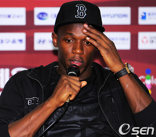 우사인 볼트가 기자회견 중 취재진의 질문을 받고 생각에 잠겨있다./rumi@osen.co.kr