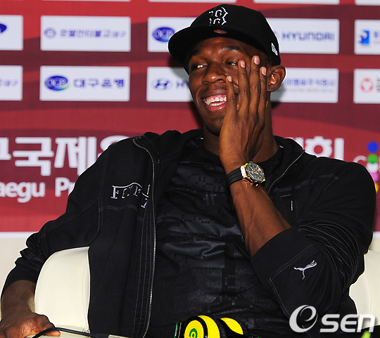 우사인 볼트가 기자회견중 취재진의 질문을 듣고 웃고 있다./rumi@osen.co.kr