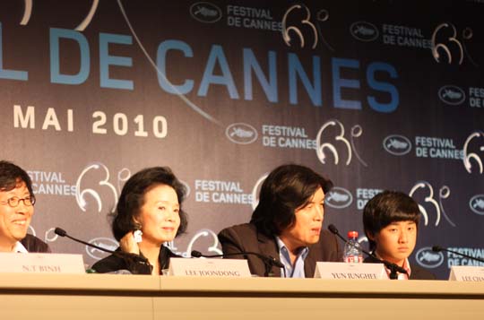 현지시각으로 19일 오전 11시 15분 프랑스 칸 펠레 드 페스티벌의 대회의장에서 제63회 칸국제영화제 경쟁부문에 진출한 영화 ‘시’의 공식기자회견이 열렸다. 이창동 감독과 주연 배우 윤정희, 이다윗 군이 자리했다.