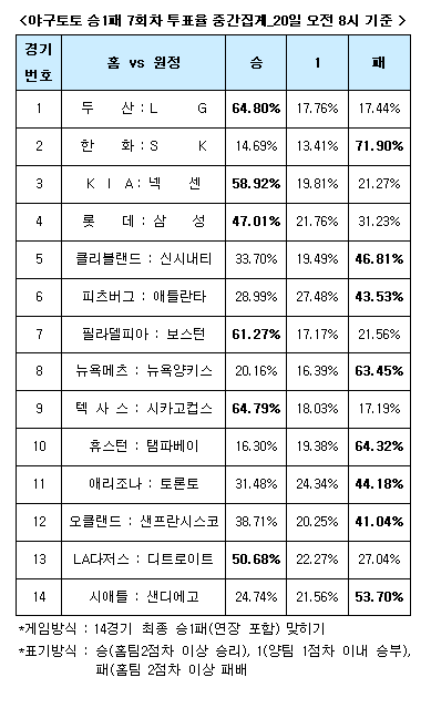 야구토토 승1패 7회차 투표율 중간 집계 결과… 두산, LG에 승리 전망. 미국프로야구 인터리그 뉴욕양키스 승리 예상… 21일 16시 50분 발매마감