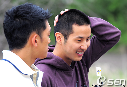 김지석이 짧게 자른 머리를 만지며 어색해 하고 있다. /jpnews@osen.co.kr