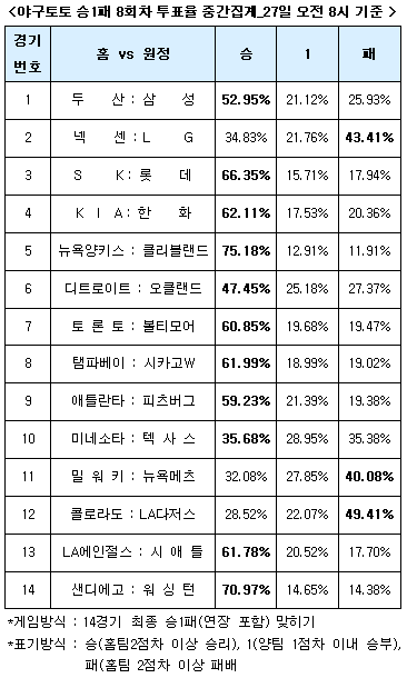 야구토토 승1패 8회차 투표율 중간 집계 결과…SK, 롯데에 승리 전망. 미국프로야구 MLB 박찬호 소속 뉴욕양키스 승리 예상…28일 18시 20분 발매마감