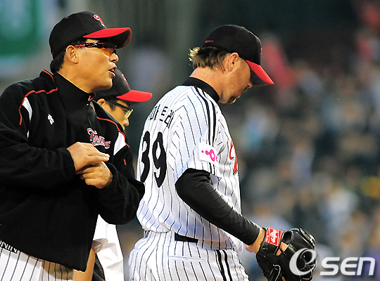 더마트레는 2회에 내야 땅볼 2개와 포수 파울 플라이로 깔끔하게 삼자범퇴를 시켜 안정을 취하는 듯 싶었다. 그러나 3회 선두타자 이용규를 또다시 볼넷으로 출루시키며 3안타를 맞고 3점을 더 내줬다.