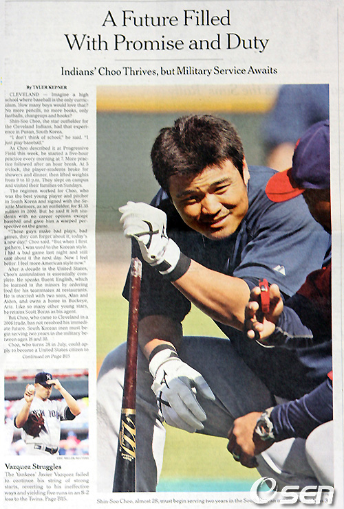 지난 4월 뉴양키스타디움에서 만난 엠엘비닷컴 양키스 담당 기자인 브라이언 호치(28)도 "추신수는 정말 뛰어난 선수"라는 말을, AP 통신의 척 무어 기자도 "추신수는 클리블랜드의 영웅"이라고 자신 있게 소개했다.