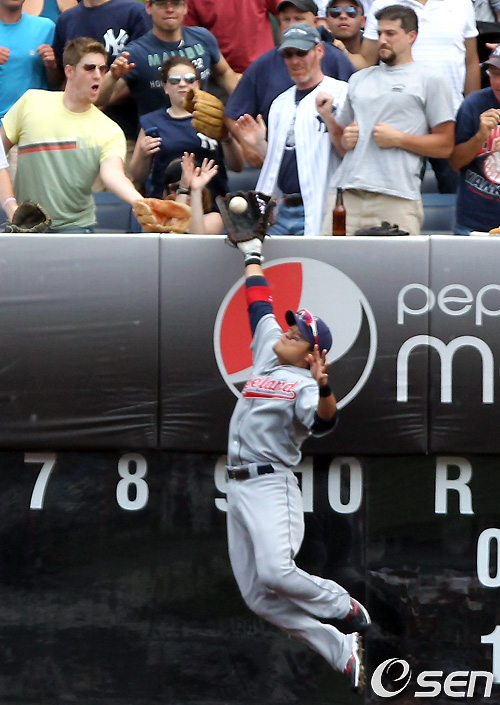 3회말 1사 양키스 닉 스위셔의 홈런성 타구를 추신수가 담장에서 뛰어올라 잡는 듯 했으나 글러브에 들어갔다 튀어나오는 2루타를 주고 있다. /OSEN=타임스퀘어 비주얼