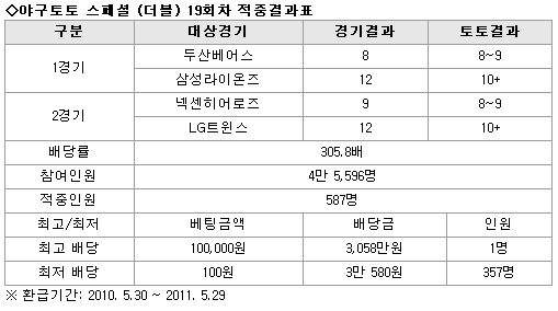 2010시즌 야구토토 스페셜 19회차 적중결과. 삼성·LG 승리…21회차 5일(토) 오후 4시 50분 발매마감