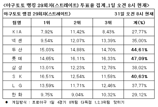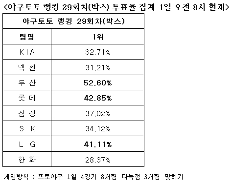 순위에 상관없이 다득점 3개팀만을 맞히는 '박스' 게임에서는 두산(52.60%), 롯데(42.85%), LG(41.11%)가 가장 많은 득점을 기록할 것으로 집계됐다.