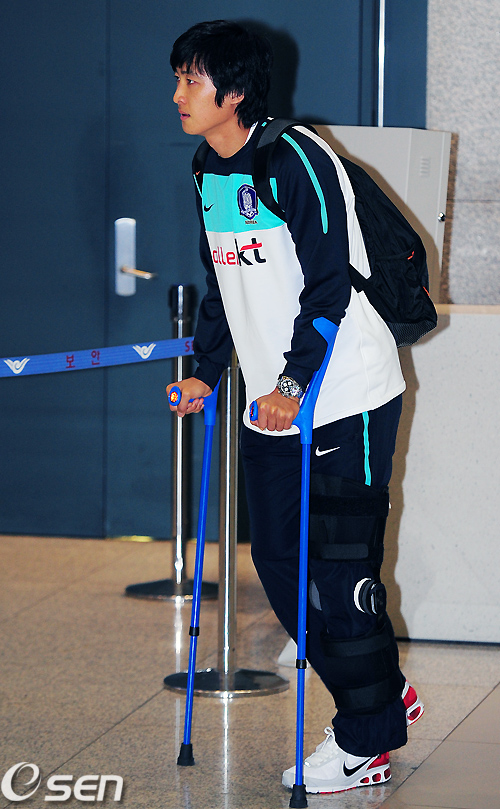 곽태휘가 목발을 짚으며 입국장을 빠져나오고 있다. /rumi@osen.co.kr
