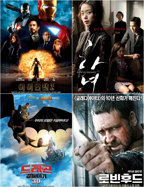 영화진흥위원회 통합전산망의 집계 결과에 따르면 지난 5월부터 6월 2일까지 '아이언맨2', '하녀', '드래곤 길들이기', '로빈후드'가 각각 480만여만, 220여만, 155여만, 150여만명의 관객수를 기록했다.