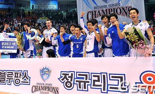<사진> 지난 시즌 챔피언결정전서 우승한 뒤 환호하는 삼성화재 선수들.