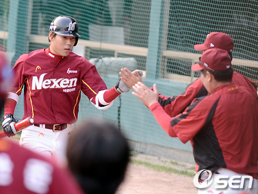 2회초 2사 2루 넥센 강정호가 선제 좌월 2점홈런을 날리고 홈을 밟은 뒤 김시진 감독과 하이파이브를 하고 있다. /soul1014@osen.co.kr