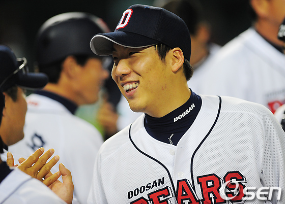 경기를 마치고 두산 김현수가 환하게 웃으며 코치들과 하이파이브를 하고 있다./rumi@osen.co.kr