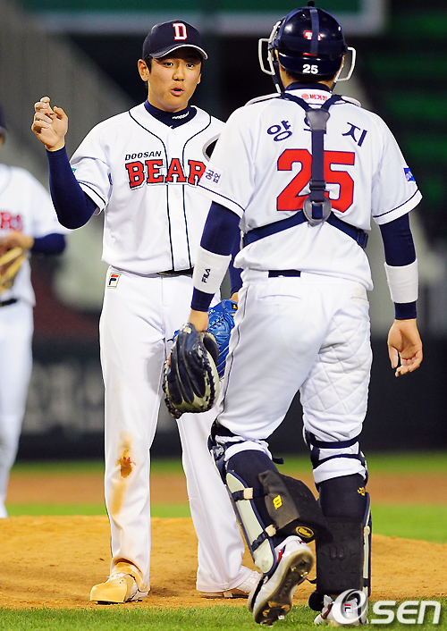 경기를 마치고 두산 성영훈 투수와 양의지 포수가 기쁨을 나누고 있다./rumi@osen.co.kr