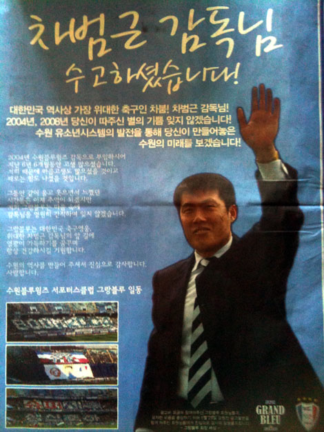 수원 삼성 블루윙즈의 서포터스 클럽인 그랑블루가 오는 6일 차범근 감독의 고별전을 앞두고 차범근 감독에게 감사의 뜻을 담은 광고를 게재했다.