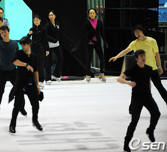 안도 미키와 아사다 마오가 남자 선수들이 2PM의 하트비트 공연을 연습하는 모습을 지켜보고 있다. /rumi@osen.co.kr